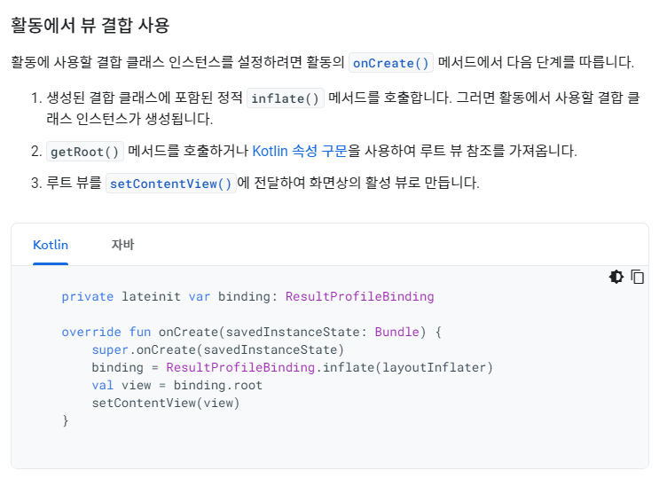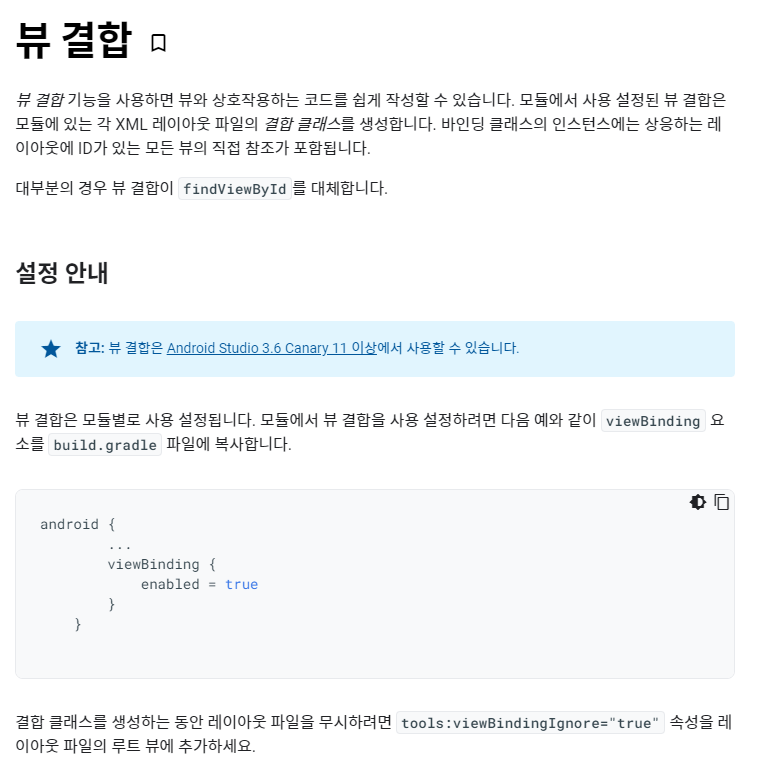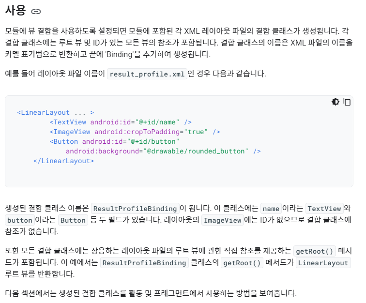 뷰 결합 기능을 사용하면 뷰와 상호작용하는 코드를 쉽게 작성할 수 있습니다. 모듈에서 사용 설정된 뷰 결합은 모듈에 있는 각 XML 레이아웃 파일의 결합 클래스를 생성합니다. 바인딩 클래스의